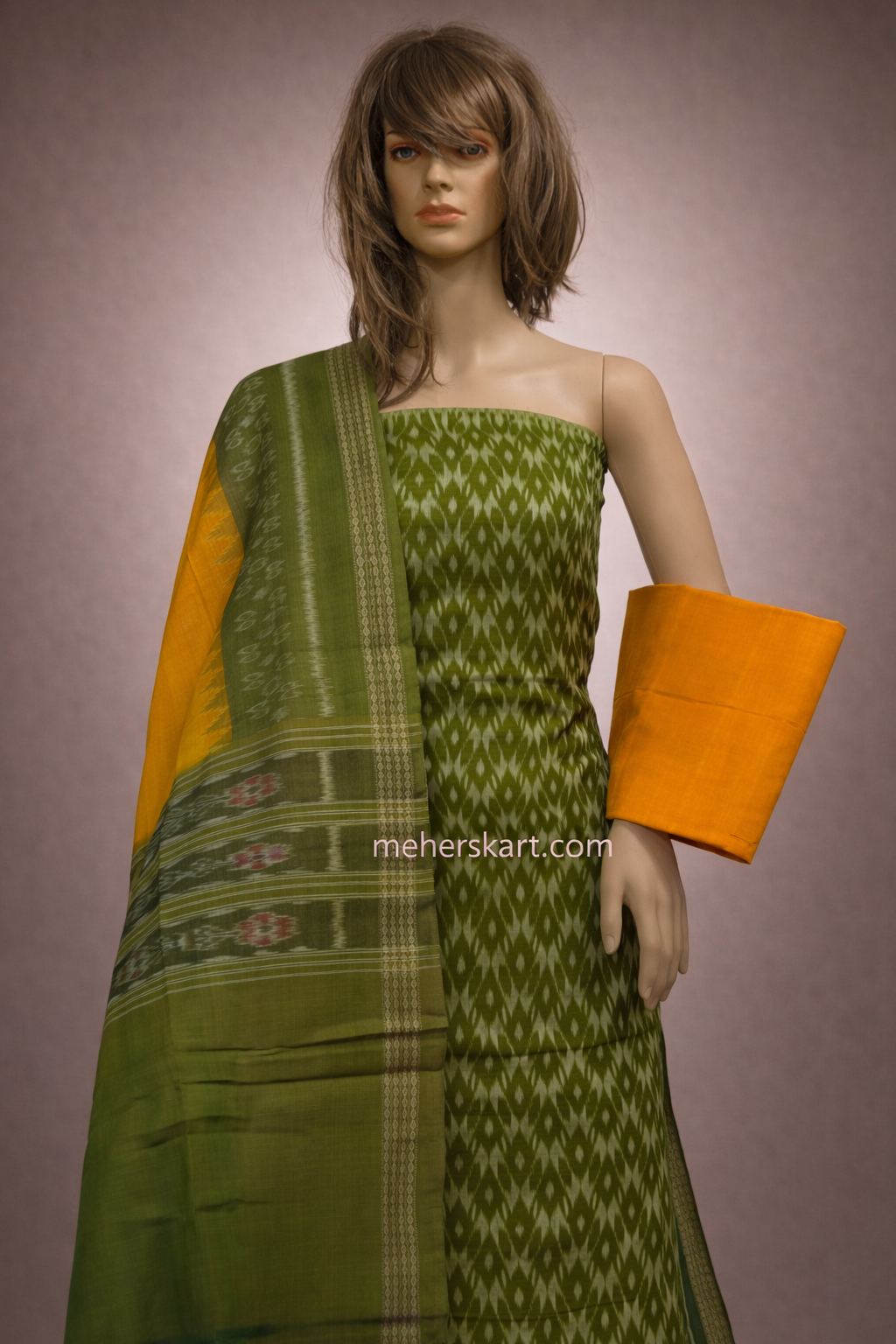 Sambalpuri Unstitiched Dress Meterial Mehendi Yellow